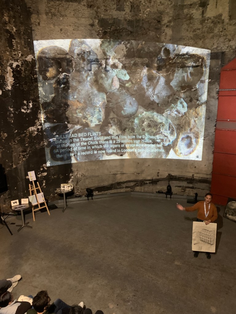 ‘Excavate’ film being Projected onto the Brunels’ Thames Tunnel shaft wall at the Brunel Museum during their Open Day 22nd September 2024, showing the geological strata of the Bullhead Bed Flints